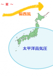偏西風が日本の北(上の方)を通りやすくなります。上空の風が弱いため、台風が偏西風の影響を受ける事がない。